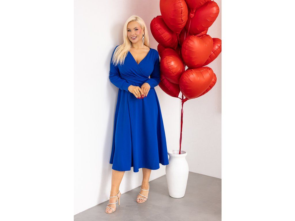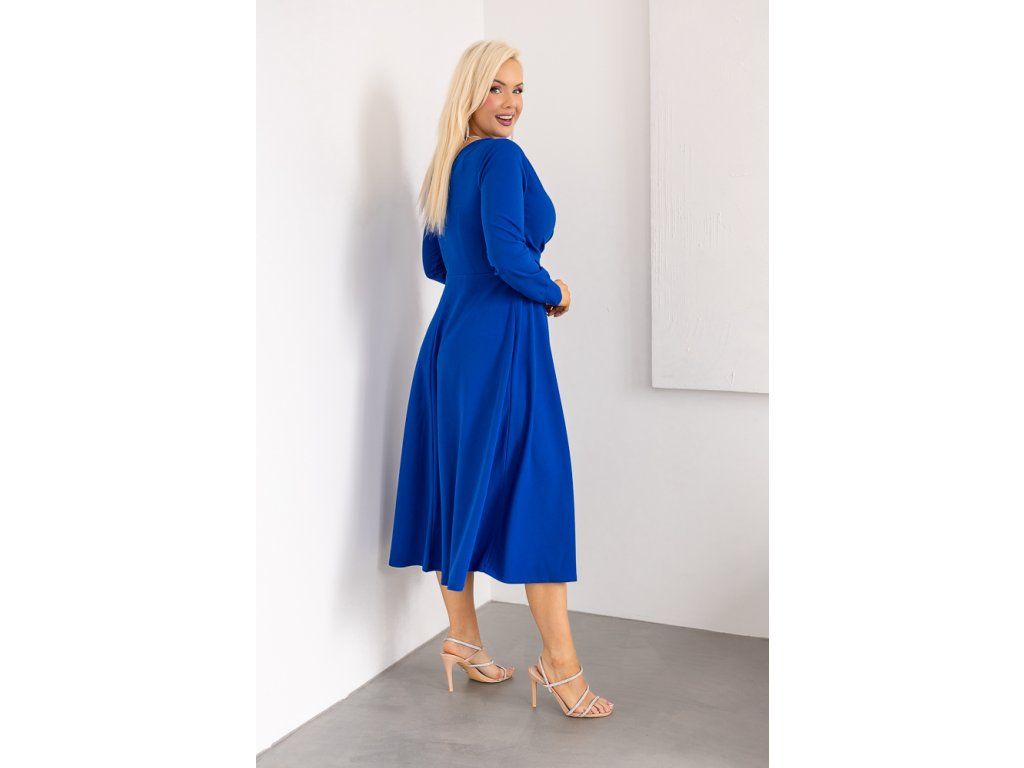 Midi délka působí velmi žensky a elegantně, zatímco sytá modrá barva dodává outfitu hloubku a luxusní nádech. Šaty jsou ideální jak na běžné nošení, tak na slavnostnější příležitosti.